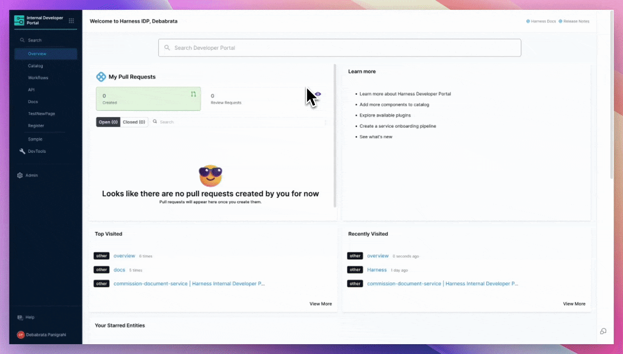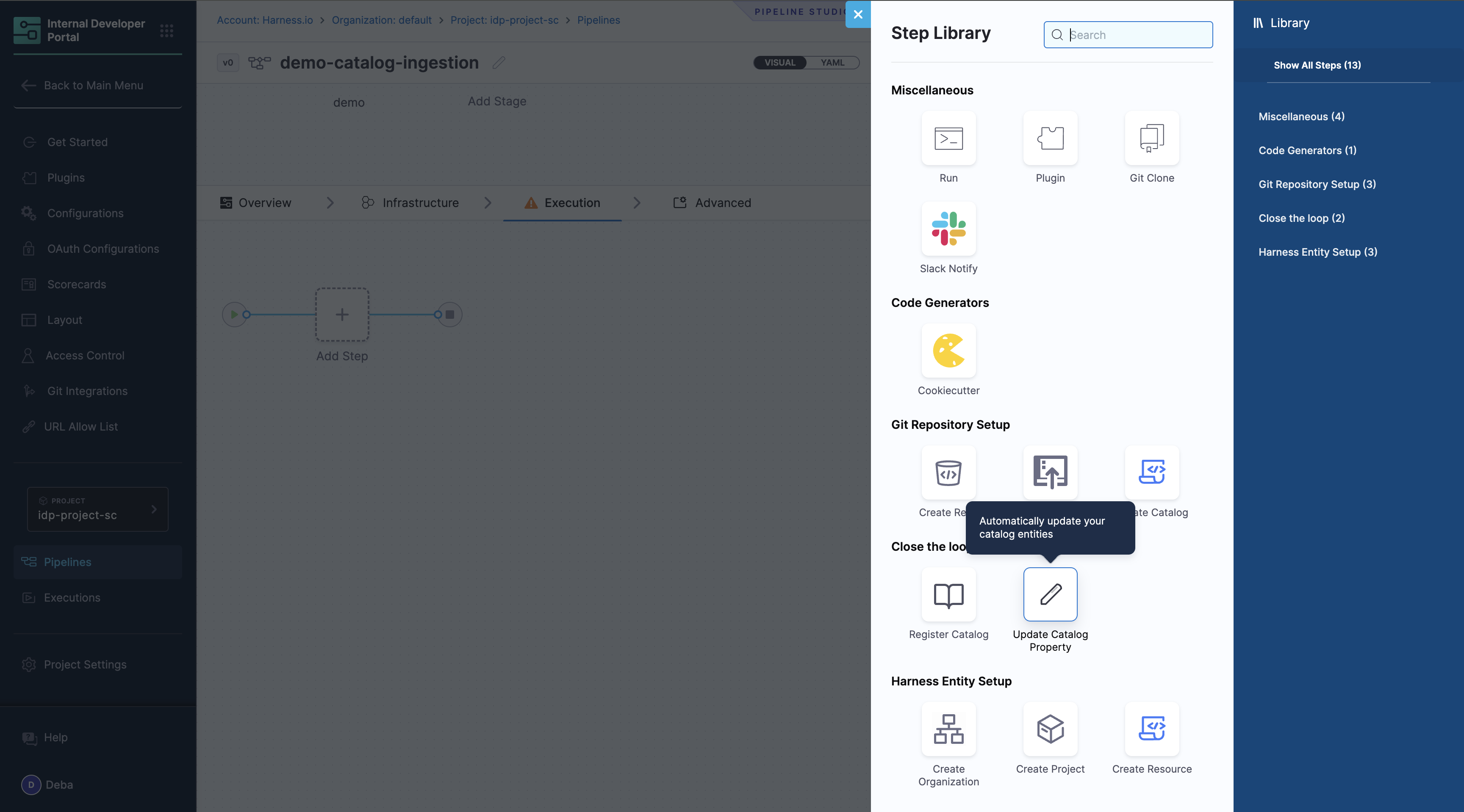 Harness IDP includes a native IDP Stage where all IDP-specific tasks required for pipeline execution are pre-configured as pipeline steps within the stage. This enables quick and efficient creation of self-service workflows.